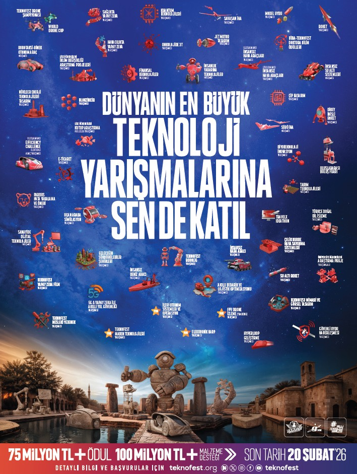 Dünyanın en büyük havacılık, uzay ve teknoloji festivali TEKNOFEST kapsamında düzenlenen 2026 yılı teknoloji yarışmalarına başvurular başladı. Bu yıl yeni adresi Şanlıurfa olan TEKNOFEST, 75 milyon TL ödül ve 100 milyon TL’den fazla maddi desteğiyle genç zihinleri yeni keşiflere davet ediyor. Fikirleri projeye, projeleri geleceğe dönüştürmek isteyenler için yarışma başvuruları ise 20 Şubat’a kadar devam ediyor!